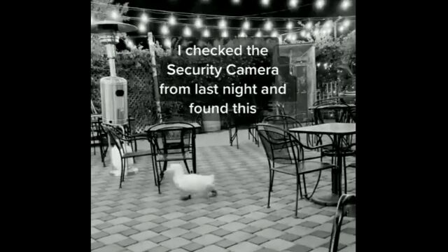 飲食店らしきテラスを撮影した防犯カメラによって捉えられた、夜中に走り回るアヒルの映像。